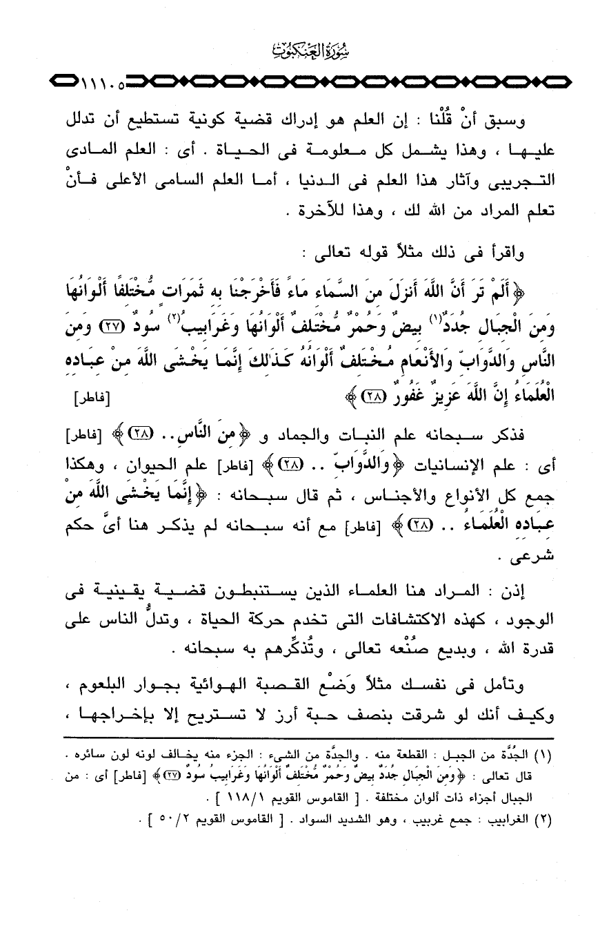 واقرأ في ذلك مثلاً قوله تعالى: {أَلَمْ تَرَ أَنَّ الله أنزَلَ مِنَ السمآء مَآءً فَأَخْرَجْنَا بِهِ ثَمَرَاتٍ مُّخْتَلِفاً أَلْوَانُهَا وَمِنَ الجبال جُدَدٌ بِيضٌ وَحُمْرٌ مُّخْتَلِفٌ أَلْوَانُهَا وَغَرَابِيبُ سُودٌ وَمِنَ الناس والدوآب والأنعام مُخْتَلِفٌ أَلْوَانُهُ كَذَلِكَ إِنَّمَا يَخْشَى الله مِنْ عِبَادِهِ العلماء إِنَّ الله عَزِيزٌ غَفُورٌ}