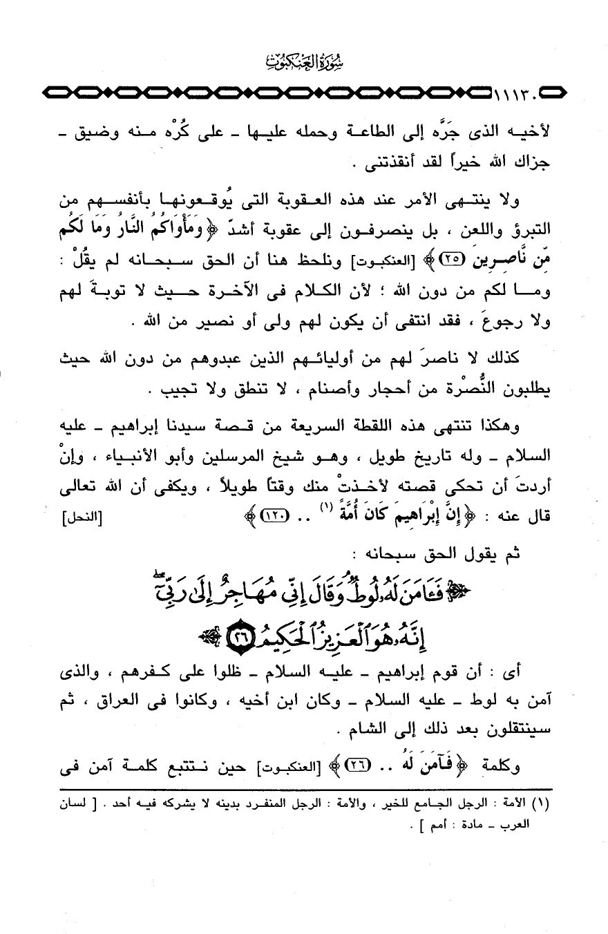 وهكذا تنتهي هذه اللقطة السريعة من قصة سيدنا إبراهيم - عليه السلام - وله تاريخ طويل، وهو شيخ المرسلين وأبو الأنبياء، وإنْ أردتَ أن تحكي قصته لأخذتْ منك وقتاً طويلاً، ويكفي أن الله تعالى قال عنه: {إِنَّ إِبْرَاهِيمَ كَانَ أُمَّةً ... } [النحل: 120] .