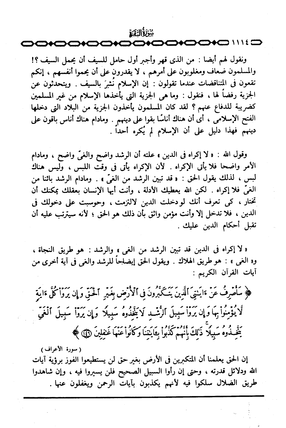 {لاَ إِكْرَاهَ فِي الدين قَد تَّبَيَّنَ الرشد مِنَ الغي} والرشد: هو طريق النجاة، و «الغي» : هو طريق الهلاك. ويقول الحق إيضاحاً للرشد والغي في آية أخرى من آيات القرآن الكريم: {سَأَصْرِفُ عَنْ آيَاتِي الذين يَتَكَبَّرُونَ فِي الأرض بِغَيْرِ الحق وَإِن يَرَوْاْ كُلَّ آيَةٍ لاَّ يُؤْمِنُواْ بِهَا وَإِن يَرَوْاْ سَبِيلَ الرشد لاَ يَتَّخِذُوهُ سَبِيلاً وَإِن يَرَوْاْ سَبِيلَ الغي يَتَّخِذُوهُ سَبِيلاً ذلك بِأَنَّهُمْ كَذَّبُواْ بِآيَاتِنَا وَكَانُواْ عَنْهَا غَافِلِينَ}