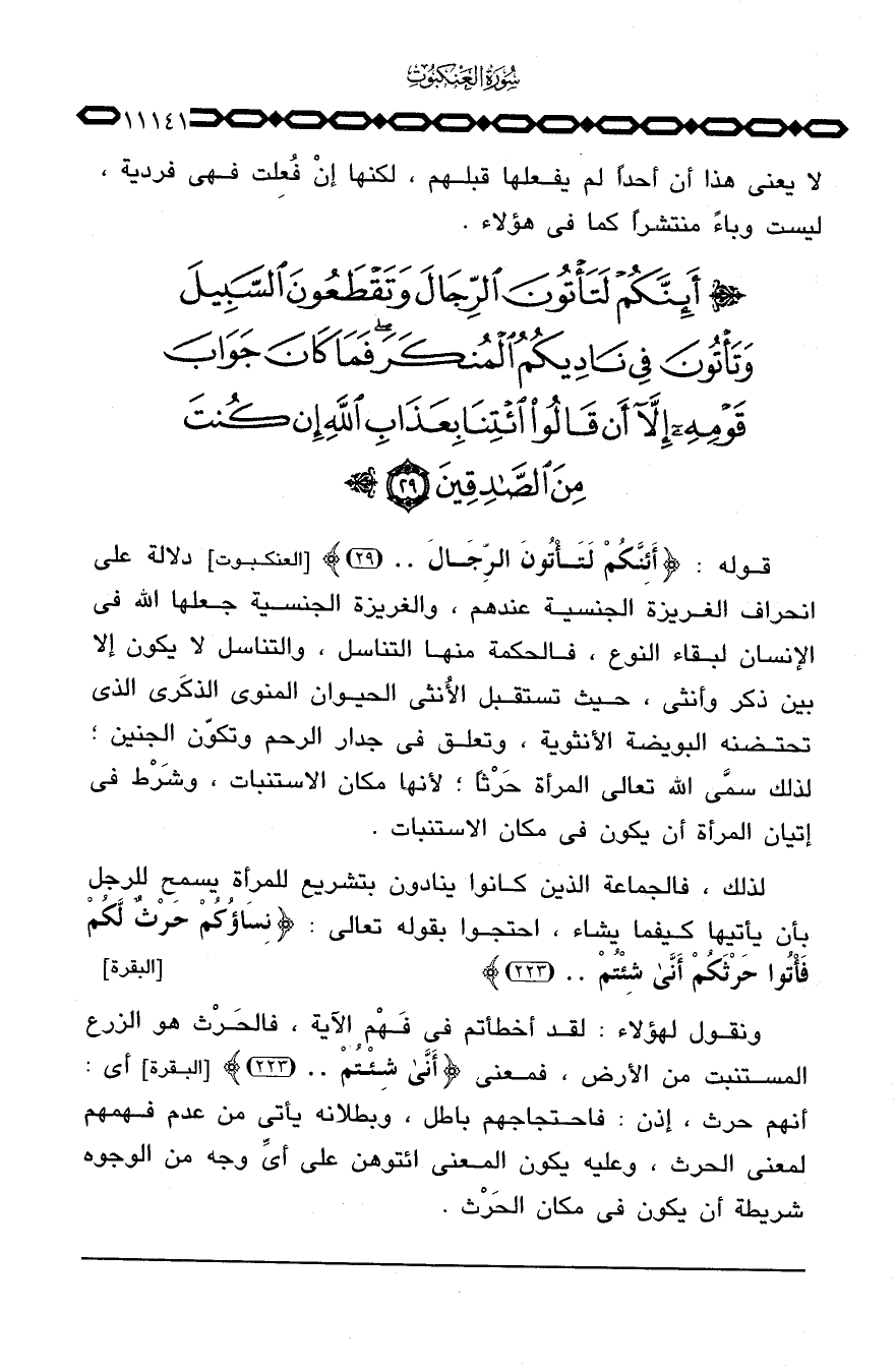 قوله: {أَئِنَّكُمْ لَتَأْتُونَ الرجال ... } [العنكبوت: 29] دلالة على انحراف الغريزة الجنسية عندهم، والغريزة الجنسية جعلها الله في الإنسان لبقاء النوع، فالحكمة منها التناسل، والتناسل لا يكون إلا بين ذكر وأنثى، حيث تستقبل الأُنثى الحيوان المنوي الذكَري الذي تحتضنه البويضة الأنثوية، وتعلق في جدار الرحم وتكوّن الجنين؛ لذلك سمَّي الله تعالى المرأة حَرْثاً؛ لأنها مكان الاستنبات، وشَرْط في إتيان المرأة أن يكون في مكان الاستنبات.