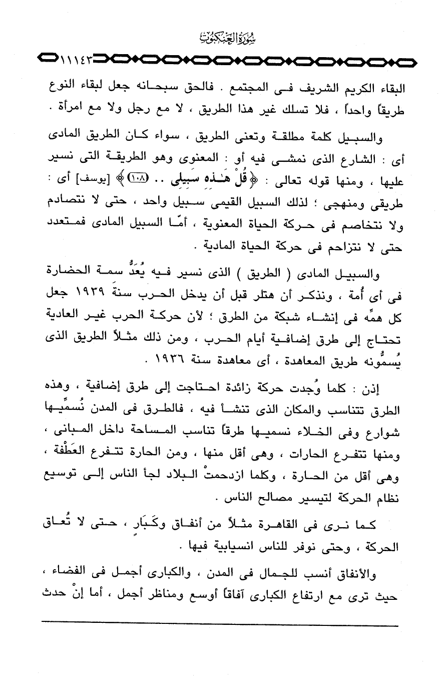 والسبيل المادي (الطريق) الذي نسير فيه يُعَدُّ سمة الحضارة في أي أُمة، ونذكر أن هتلر قبل أن يدخل الحرب سنة 1939 جعل كل همِّة في إنشاء شبكة من الطرق؛ لأن حركة الحرب غير العادية تحتاج إلى طرق إضافية أيام الحرب، ومن ذلك مثلاً الطريق الذي يُسمُّونه طريق المعاهدة، أي معاهدة سنة 1936.
