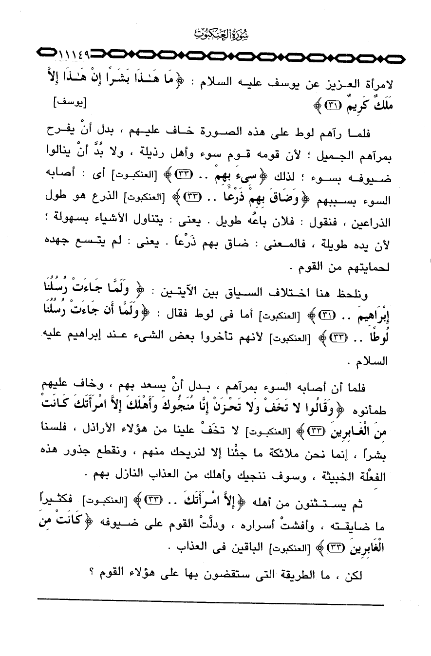 ونلحظ هنا اختلاف السياق بين الآيتين: {وَلَمَّا جَآءَتْ رُسُلُنَآ إِبْرَاهِيمَ ... } [العنكبوت: 31] أما في لوط فقال: {وَلَمَّآ أَن جَآءَتْ رُسُلُنَا لُوطاً ... } [العنكبوت: 33] لأنهم تأخروا بعض الشيء عند إبراهيم عليه السلام.