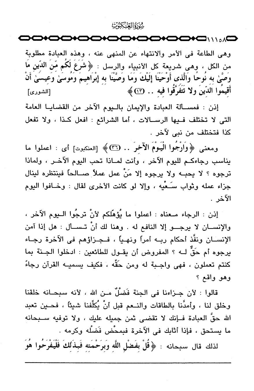 إذن: فمسألة العبادة والإيمان باليوم الآخر من القضايا العامة التي لا تختلف فيها الرسالات، أما الشرائع: افعل كذا، ولا تفعل كذا فتختلف من نبي لآخر.