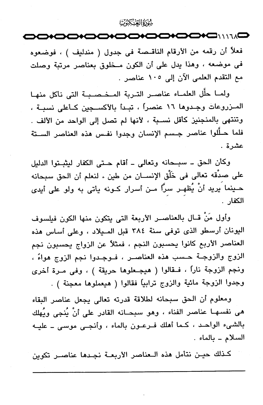 فعلاً أن رقمه من الأرقام الناقصة في جدول (مندليف) ، فوضعوه في موضعه، وهذا يدل على أن الكون مخلوق بعناصر مرتبة وصلت مع التقدم العلمي الآن إلى 105 عناصر.