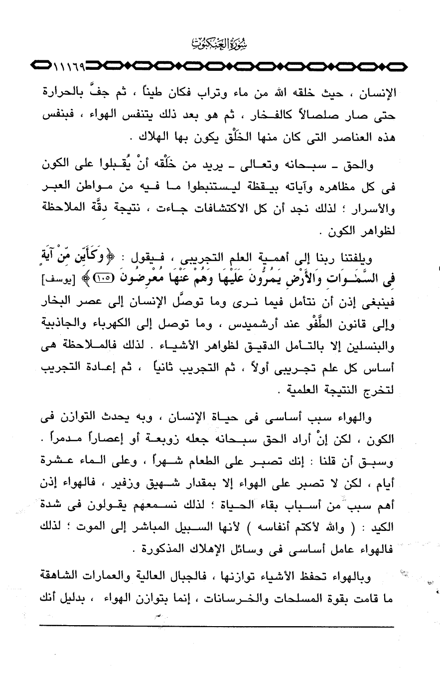 الإنسان، حيث خلقه الله من ماء وتراب فكان طيناً، ثم جفَّ بالحرارة حتى صار صلصالاً كالفخار، ثم هو بعد ذلك يتنفس الهواء، فبنفس هذه العناصر التي كان منها الخَلْق يكون بها الهلاك.
