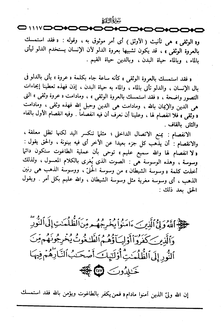{فَقَدِ استمسك بالعروة الوثقى} كأنه ساعة جاء بكلمة «عروة» يأتي بالدلو في بال الإنسان، والدلو تأتي بالماء، والماء به حياة البدن، إذن فهذه تعطينا إيحاءات التصور واضحة، {فَقَدِ استمسك بالعروة الوثقى} ، وما دامت «عروة وثقى» التي هي الدين والإيمان بالله، وما دامت هي الدين وحبل الله فهذه وثقى، وما دامت «وثقى» فلا انفصام لها، وعلينا أن نعرف أن فيه انفصاماً. وفيه انفصام الأول بالفاء والثاني بالقاف.