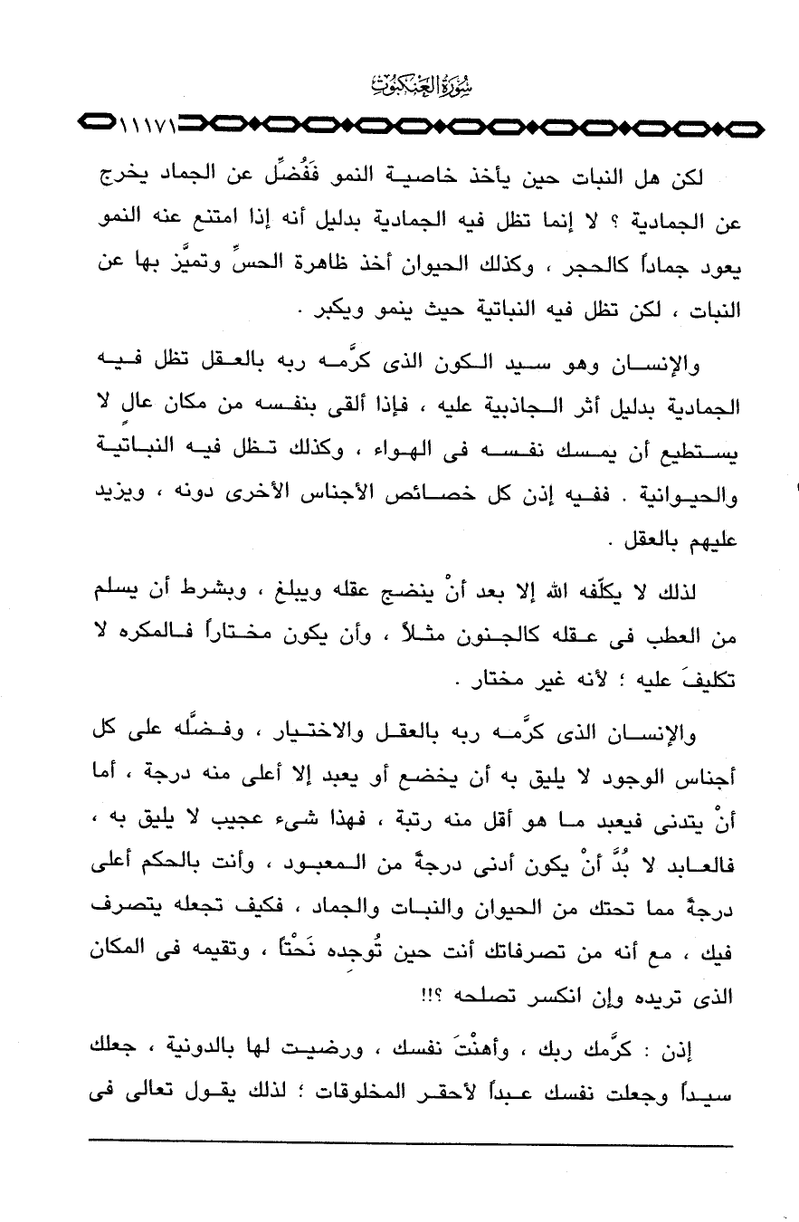 والإنسان وهو سيد الكون الذي كرَّمه ربه بالعقل تظل فيه الجمادية بدليل أثر الجاذبية عليه، فإذا ألقى بنفسه من مكان عالٍ لا يستطيع أن يمسك نفسه في الهواء، وكذلك تظل فيه النباتية والحيوانية، ففيه إذن كل خصائص الأجناس الأخرى دونه، ويزيد عليهم العقل.