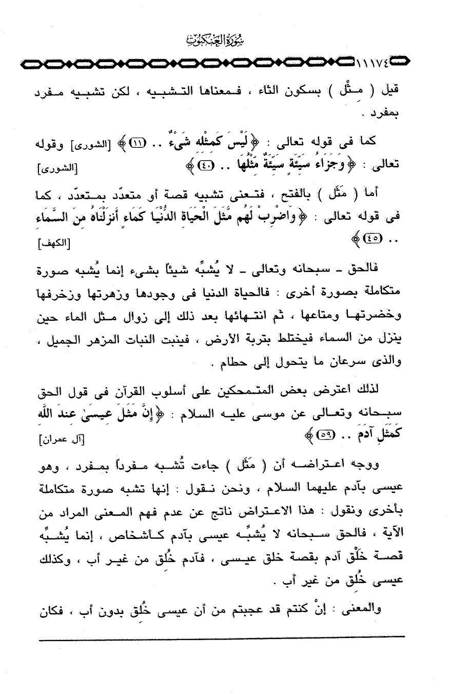 ووجه اعتراضه أن (مَثَل) جاءت تُشبه مفرداً بمفرد، وهو عيسى بآدم عليهما السلام، ونحن نقول: إنها تشبه صورة متكاملة بأخرى ونقول: هذا الاعتراض ناتج عن عدم فهم المعنى المراد من الآية، فالحق سبحانه لا يُشبِّه عيسى بآدم كأشخاص، إنما يُشبِّه قصة خَلْق آدم بقصة خلق عيسى، فآدم خُلِق من غير أب، وكذلك عيسى خُلِق من غير أب.