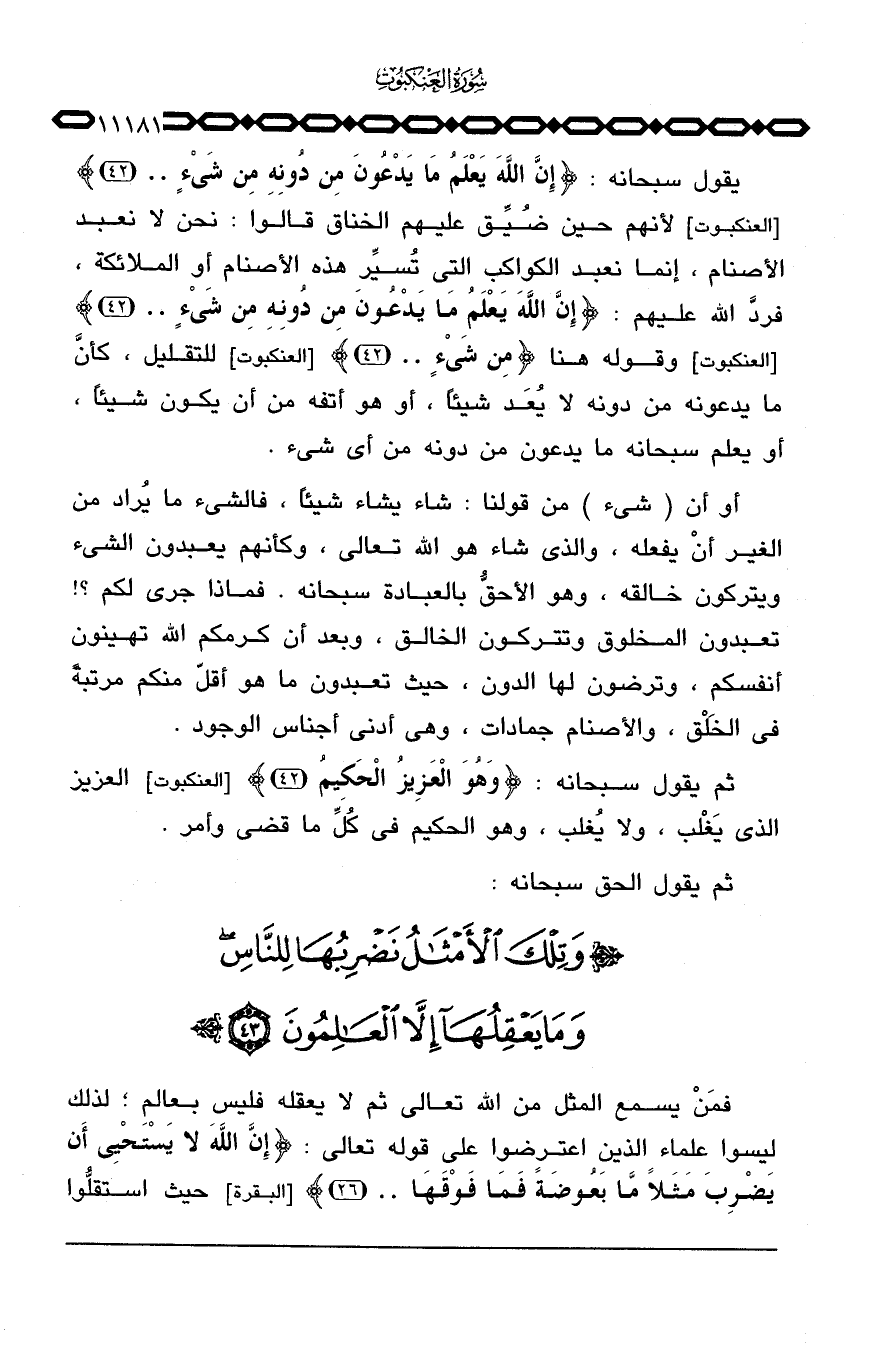 يقول سبحانه: {إِنَّ الله يَعْلَمُ مَا يَدْعُونَ مِن دُونِهِ مِن شَيْءٍ ... } [العنكبوت: 42] لأنهم حين ضُيِّق عليهم الخناق قالوا: نحن لا نعبد الأصنام، إنما نعبد الكواكب التي تُسيِّر هذه الأصنام أو الملائكة، فردَّ الله عليهم: {مِن شَيْءٍ ... } [العنكبوت: 42] للتقليل، كأنَّ ما يدعونه من دونه لا يُعَد شيئاً، أو هو أتفه من أن يكون شيئاً، أو يعلم سبحانه ما يدعون من دونه من أي شيء.
