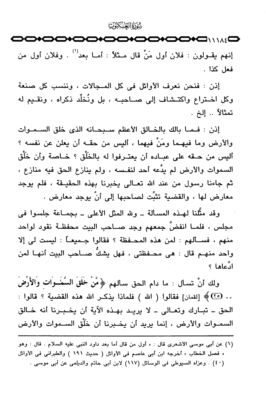 إنهم يقولون: فلان أول مَنْ قال مثلاً: أما بعد. وفلان أول من فعل كذا.