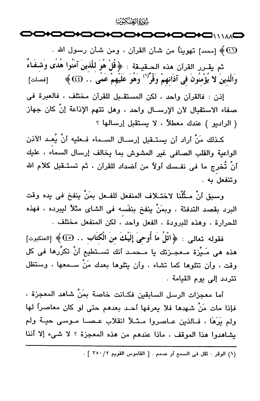 ثم يقرر القرآن هذه الحقيقة: {قُلْ هُوَ لِلَّذِينَ آمَنُواْ هُدًى وَشِفَآءٌ والذين لاَ يُؤْمِنُونَ في آذَانِهِمْ وَقْرٌ وَهُوَ عَلَيْهِمْ عَمًى ... } [فصلت: 44] .