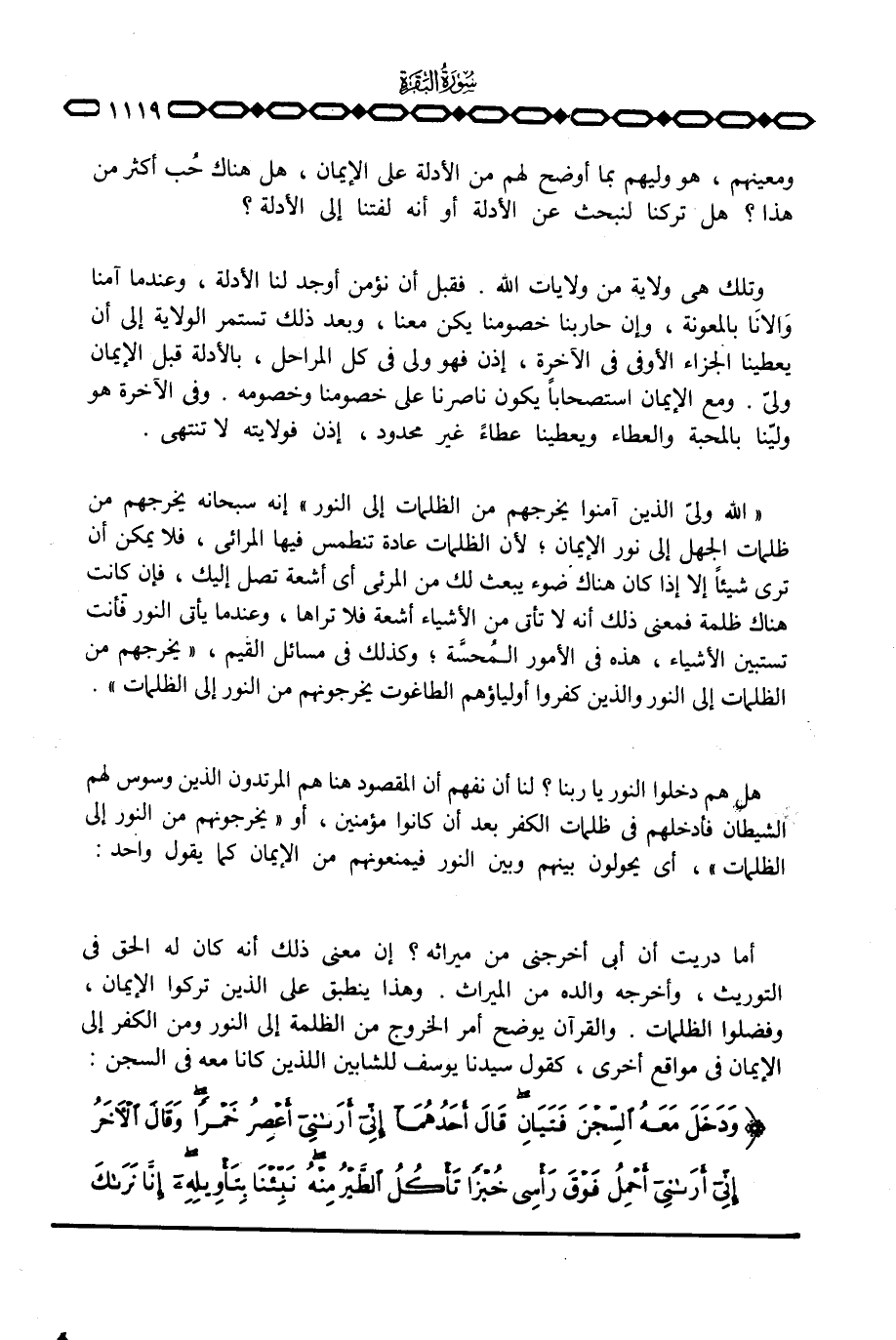 {الله وَلِيُّ الذين آمَنُواْ يُخْرِجُهُمْ مِّنَ الظلمات إِلَى النور} إنه سبحانه يخرجهم من ظلمات الجهل إلى نور الإيمان؛ لأن الظلمات عادة تنطمس فيها المرائي، فلا يمكن أن ترى شيئاً إلا إذا كان هناك ضوء يبعث لك من المرئي أي أشعة تصل إليك، فإن كانت هناك ظلمة فمعنى ذلك أنه لا يأتي من الأشياء أشعة فلا تراها، وعندما يأتي النور فأنت تستبين الأشياء، هذه في الأمور المُحسَّة؛ وكذلك في مسائل القيم، {يُخْرِجُهُمْ مِّنَ الظلمات إِلَى النور والذين كفروا أَوْلِيَآؤُهُمُ الطاغوت يُخْرِجُونَهُمْ مِّنَ النور إِلَى الظلمات} .