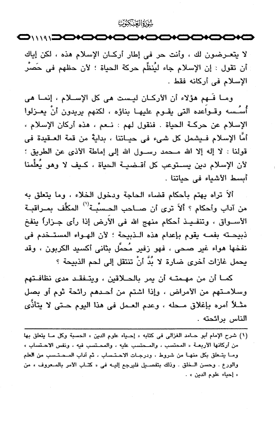 وما فَهم هؤلاء أن الأركان ليست هي كل الإسلام، إنما هي أسُسه وقواعده التي يقوم عليها بناؤه، لكنهم يريدون أنْ يعزلوا الإسلام عن حركة الحياة. فنقول لهم: نعم، هذه أركان الإسلام، أمَّا الإسلام فيشمل كل شيء في حياتنا، بداية من قمة العقيدة في قولنا: لا إله إلا الله محمد رسول الله إلى إماطة الأذى عن الطريق؛ لأن الإسلام دين يستوعب كل أقضية الحياة، كيف لا وهو يُعلِّمنا أبسط الأشياء في حياتنا.