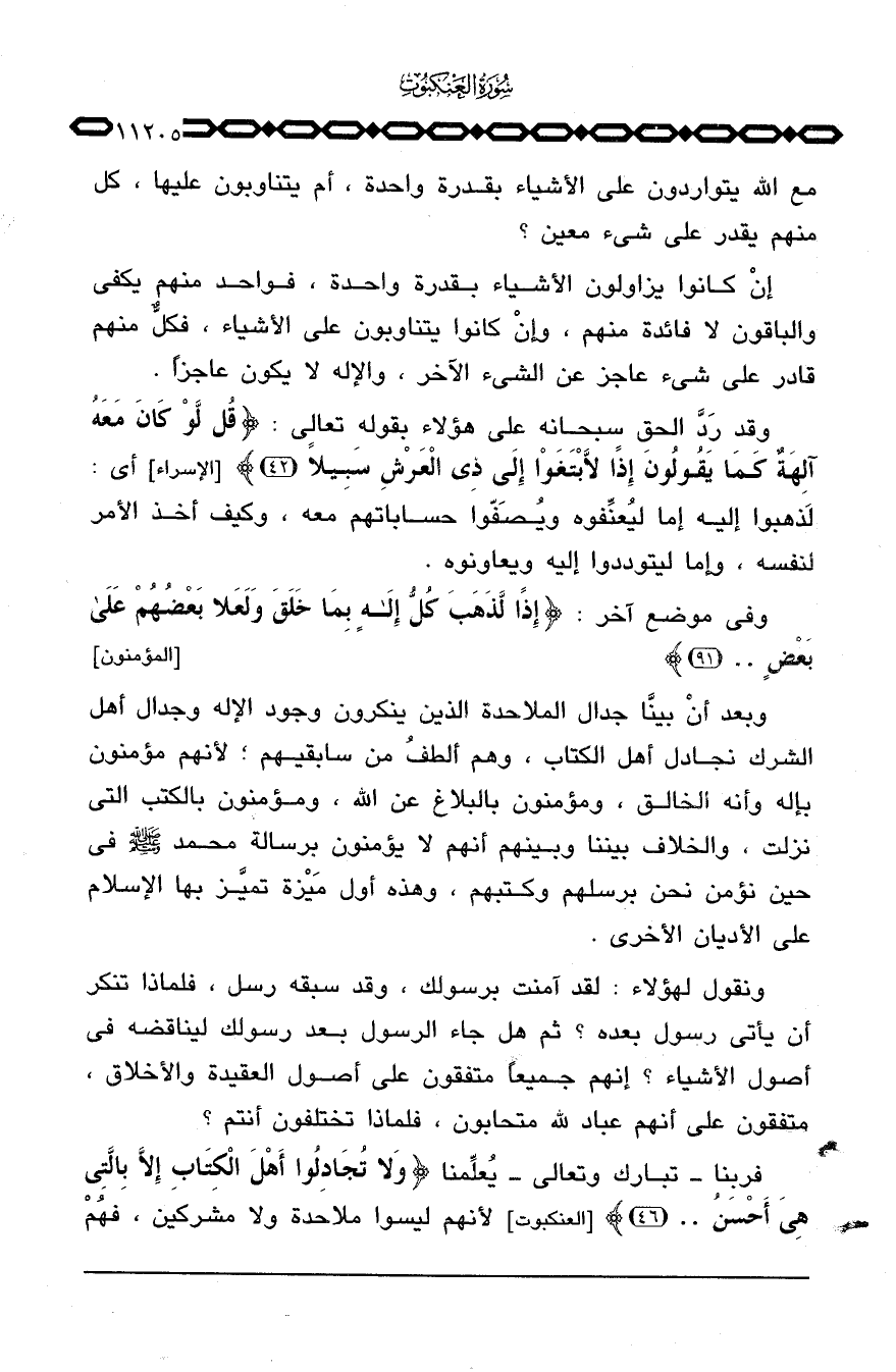 وبعد أنْ بينَّا جدال الملاحدة الذين ينكرون وجود الإله وجدال أهل الشرك نجادل أهل الكتاب، وهم ألطفُ من سابقيهم؛ لأنهم مؤمنون بإله وأنه الخالق، ومؤمنون بالبلاغ عن الله، ومؤمنون بالكتب التي نزلت، والخلاف بيننا وبينهم أنهم لا يؤمنون برسالة محمد صَلَّى اللَّهُ عَلَيْهِ وَسَلَّم َ في حين نؤمن نحن برسلهم وكتبهم، وهذه أول مَيزة تميَّز بها الإسلام على الأديان الأخرى.