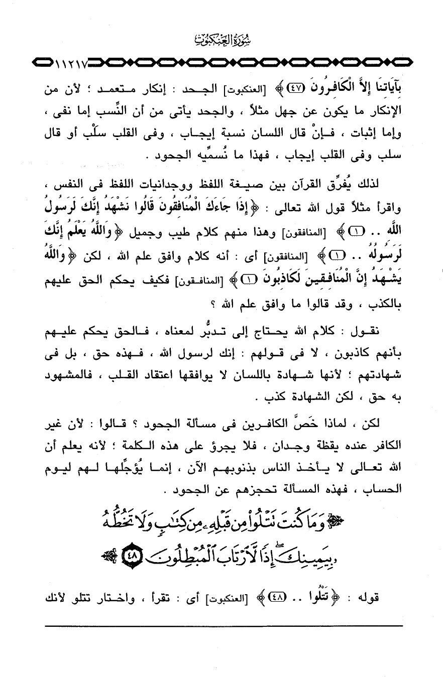 بِآيَاتِنَآ إِلاَّ الكافرون} [العنكبوت: 47] الجحد: إنكار متعمد؛ لأن من الإنكار ما يكون عن جهل مثلاً، والجحد يأتي من أن النِّسب إما نفي، وإما إثبات، فإنْ قال اللسان نسبة إيجاب، وفي القلب سَلْب أو قال سلب وفي القلب إيجاب، فهذا ما نُسمِّيه الجحود.