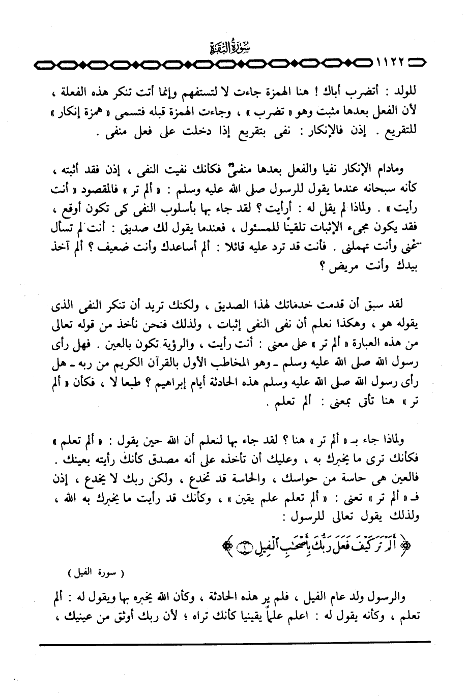 وما دام الإنكار نفيا والفعل بعدها منفيٌ فكأنك نفيت النفي، إذن فقد أثبته، كأنه سبحانه عندما يقول للرسول صَلَّى اللَّهُ عَلَيْهِ وَسَلَّم َ: {أَلَمْ تَرَ} فالمقصود «أنت رأيت» . ولماذا لم يقل له: أرأيت؟ لقد جاء بها بأسلوب النفي كي تكون أوقع، فقد يكون مجيء الإثبات تلقيناً للمسئول، فعندما يقول لك صديق: أنت لم تسأل عني وأنت تهملني. فأنت قد ترد عليه قائلا: ألم أساعدك وأنت ضعيف؟ ألم آخذ بيدك وأنت مريض؟