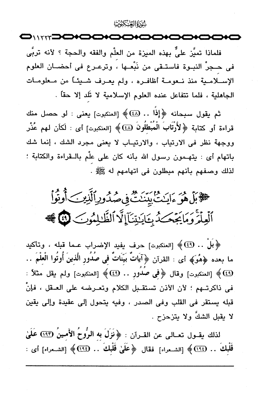{بَلْ ... } [العنكبوت: 49] حرف يفيد الإضراب عما قبله، وتأكيد ما بعده {هُوَ} أي: القرآن {آيَاتٌ بَيِّنَاتٌ فِي صُدُورِ الذين أُوتُواْ العلم ... } [العنكبوت: 49] ولم يقل مثلاً: في ذاكرتهم؛ لأن الأذن تستقبل الكلام وتعرضه على العقل، فإنْ قبله يستقر في القلب وفي الصدر، وفيه يتحول إلى عقيدة وإلى يقين لا يقبل الشكَّ ولا يتزحزح.