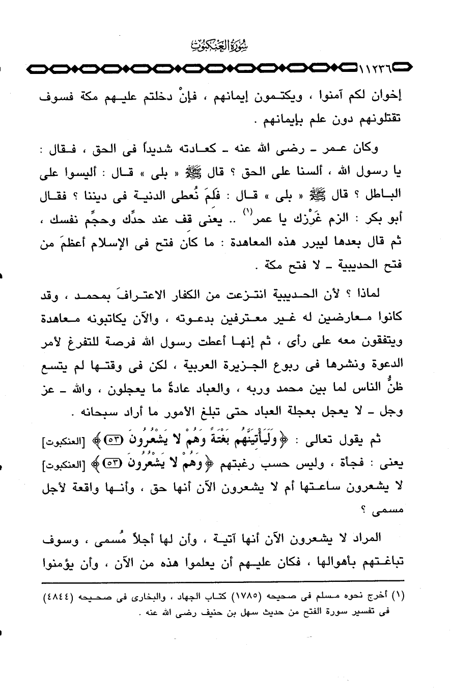 وكان عمر - رَضِيَ اللَّهُ عَنْه - كعادته شديداً في الحق، فقال: يا رسول الله، ألسنا على الحق؟ قال: صَلَّى اللَّهُ عَلَيْهِ وَسَلَّم َ:» بلى «قال: أليسوا على الباطل؟ قال صَلَّى اللَّهُ عَلَيْهِ وَسَلَّم َ» بلى «قال: فَلِمَ نعطي الدنية في ديننا؟ فقال أبو بكر: الزم غَرْزك يا عمر» . يعني قِف عند حدِّك وحجِّم نفسك، ثم قال بعدها ليبرر هذه المعاهدة: ما كان فتح في الإسلام أعظمَ من فتح الحديبية - لا فتح مكة.