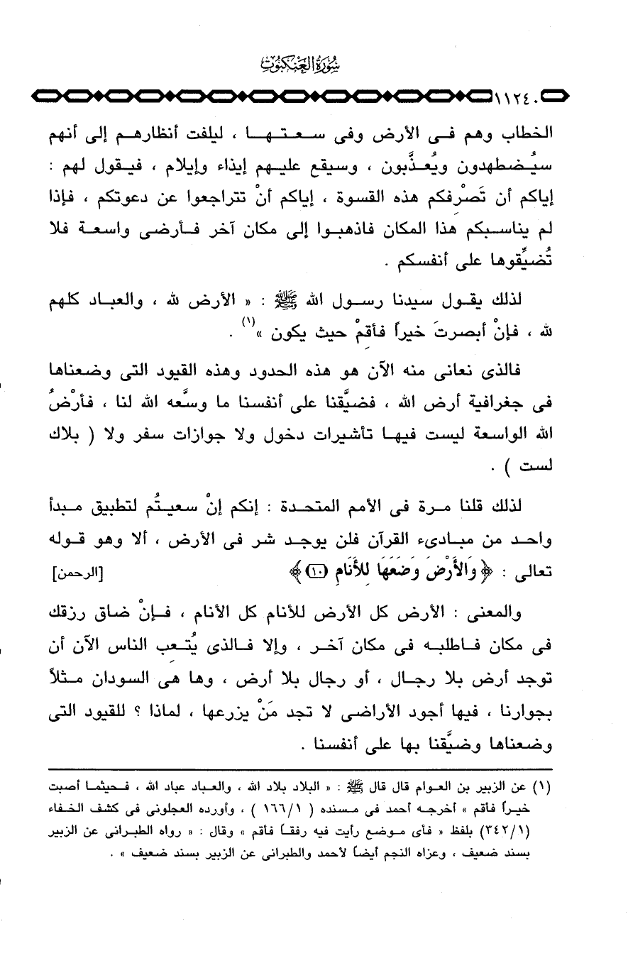 فالذي نعاني منه الآن هو هذه الحدود وهذه القيود التي وضعناها في جغرافية أرض الله، فضيَّقنا على أنفسنا ما وسَّعه الله لنا، فأرْضُ الله الواسعة ليست فيها تأشيرات دخول ولا جوازات سفر ولا (بلاك لست) .