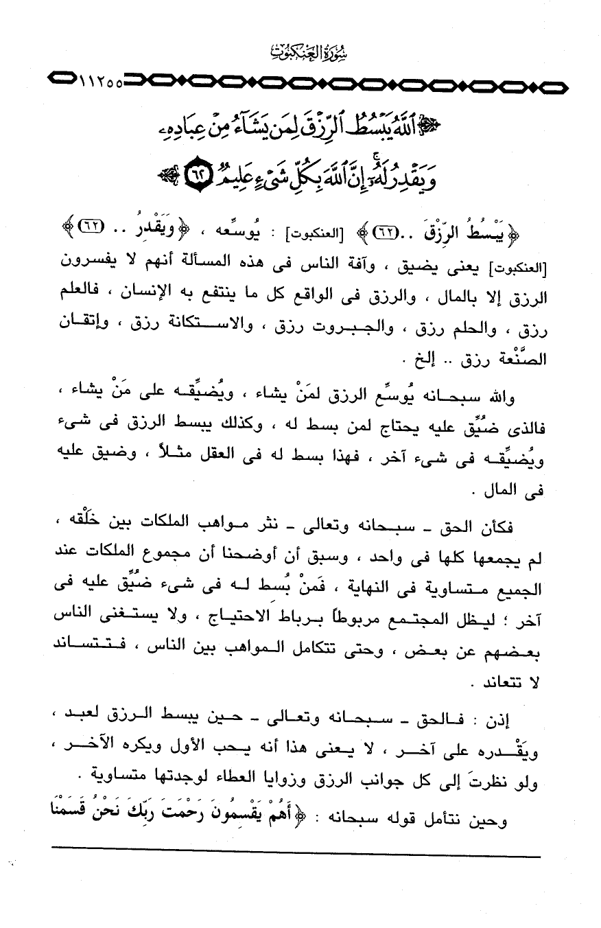 {يَبْسُطُ الرزق ... } [العنكبوت: 62] : يُوسِّعه، {وَيَقْدِرُ ... } [العنكبوت: 62] يعني يضيق، وآفة الناس في هذه المسألة أنهم لا يفسرون الرزق إلا بالمال، والرزق في الواقع كل ما ينتفع به الإنسان، فالعلم رزق، والحلم رزق، والجبروت رزق، والاستكانة رزق، وإتقان الصَّنْعة رزق. . إلخ.