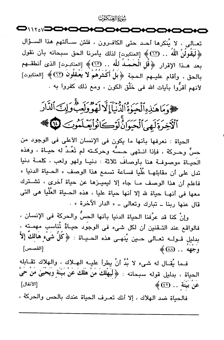الحياة: نعرفها بأنها ما يكون في الإنسان الأعلى في الوجود من حِسٍّ وحركة، فإذا انتهى حِسُّه وحركته لم تَعُدْ له حياة، وهذه الحياة موصوفة هنا بأوصاف ثلاثة: دنيا ولهو ولعب، كلمة دنيا تدل على أن مقابلها عُلْيا فساعة تسمع هذا الوصف «الحياة الدنيا» فاعلم أن هذا الوصف ما جاء إلا ليميزها عن حياة أخرى، تشترك معها في أنها حياة لله إلا أنها حياة عليا، هذه الحياة العُلْيا هي التي قال عنها ربنا - تبارك وتعالى - «الدار الآخرة» .