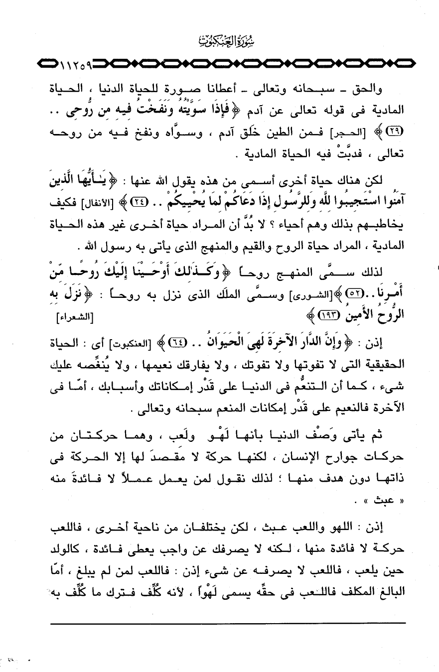 لكن هناك حياة أخرى أسمى من هذه يقول الله عنها: {ياأيها الذين آمَنُواْ استجيبوا للَّهِ وَلِلرَّسُولِ إِذَا دَعَاكُم لِمَا يُحْيِيكُمْ ... } [الأنفال: 24] فكيف يخاطبهم بذلك وهم أحياء؟ لا بُدَّ أن المراد حياة أخرى غير هذه الحياة المادية، المراد حياة الروح والقيم والمنهج الذي يأتي به رسول الله.
