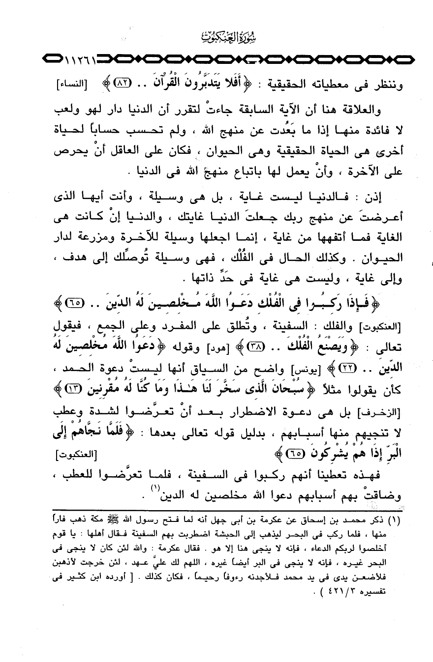 {فَإِذَا رَكِبُواْ فِي الفلك دَعَوُاْ الله مُخْلِصِينَ لَهُ الدين ... } [العنبكوت: 65] والفلك: السفينة، وتُطلق على المفرد وعلى الجمع، فيقول تعالى: {وَيَصْنَعُ الفلك ... } [هود: 38] وقوله {دَعَوُاْ الله مُخْلِصِينَ لَهُ الدين ... } [يونس: 22] واضح من السياق أنها ليستْ دعوة الحمد، كأن يقولوا مثلاً {سُبْحَانَ الذي سَخَّرَ لَنَا هذا وَمَا كُنَّا لَهُ مُقْرِنِينَ} [الزخرف: 13] بل هي دعوة الاضطرار بعد أنْ تعرَّضوا لشدة وعطب لا تنجيهم منها أسبابهم، بدليل قوله تعالى بعدها: {فَلَمَّا نَجَّاهُمْ إِلَى البر إِذَا هُمْ يُشْرِكُونَ} [العنكبوت: 65] .