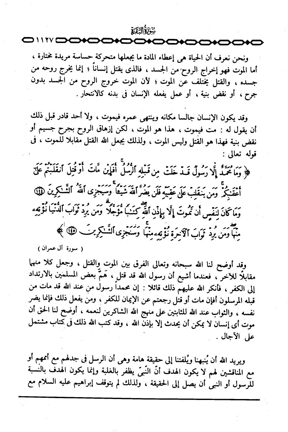 وقد أوضح لنا الله سبحانه وتعالى الفرق بين الموت والقتل، وجعل كلا منهما مقابلاً للآخر، فعندما أشيع أن رسول الله قد قتل، هَمَّ بعض المسلمين بالارتداد إلى الكفر، فأنكر الله عليهم ذلك قائلاً: إن محمداً رسول من عند الله قد مات من قبله المرسلون أفإن مات أو قتل رجعتم عن الإيمان للكفر، ومَنْ يفعل ذلك فإنما يضر نفسه، والثواب عند الله للثابتين على منهج الله الشاكرين لنعمه، أوضح لنا الحق أن موت أي إنسان لا يمكن أن يحدث إلا بإذن الله، وقد كتب الله ذلك في كتاب مشتمل على الآجال.