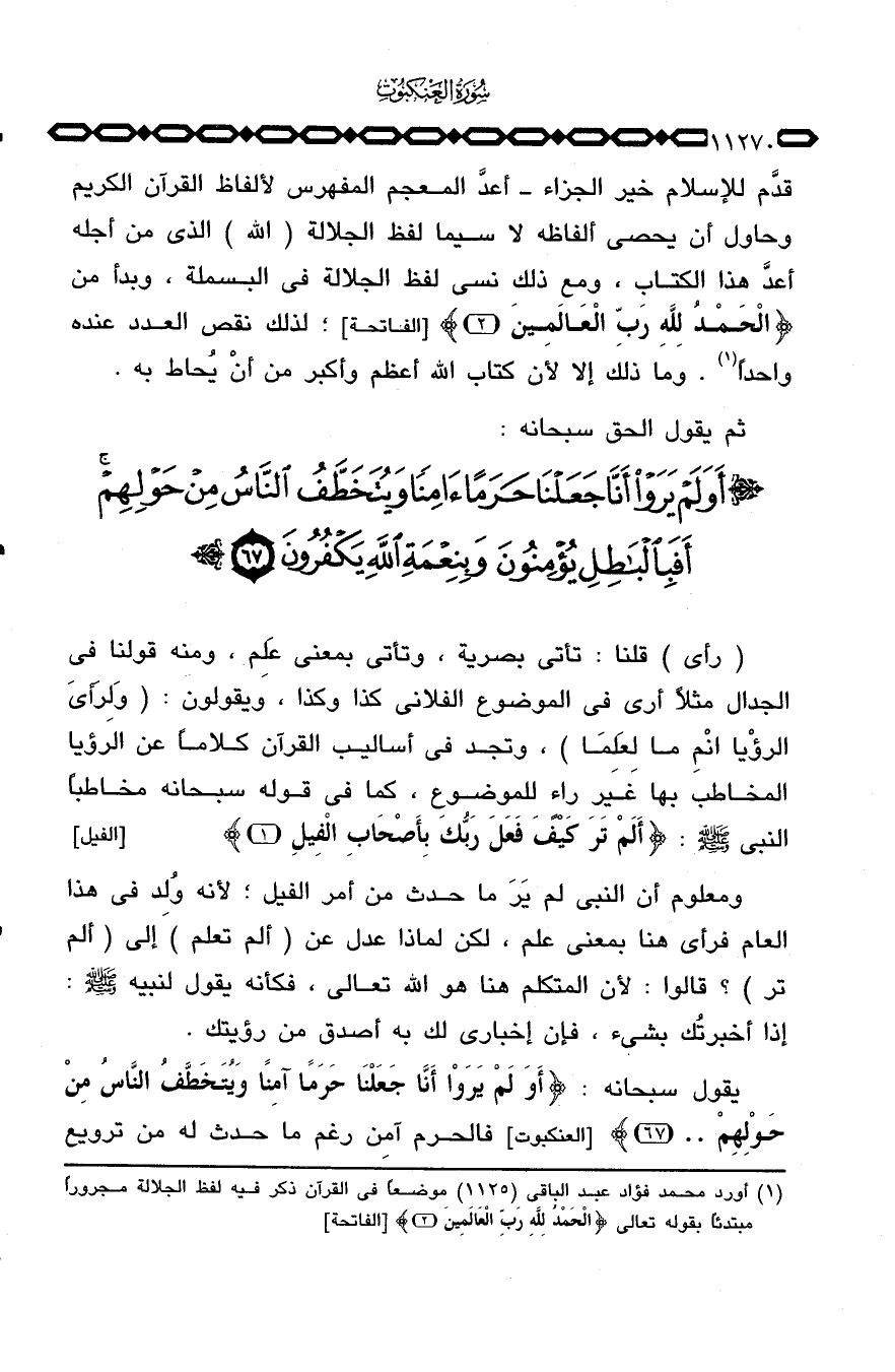 قدَّم للإسلام خير الجزاء - أعدَّ المعجم المفهرس لألفاظ القرآن الكريم وحاول أن يحصي ألفاظه لا سيما لفظ الجلالة (الله) الذي من أجله أعدَّ هذا الكتاب، ومع ذلك نسي لفظ الجلالة في البسملة، وبدأ من {الحمد للَّهِ رَبِّ العالمين} [الفاتحة: 2] ؛ لذلك نقص العدد عنده واحداً. وما ذلك إلا لأن كتاب الله أعظم وأكبر من أنْ يُحاط به.