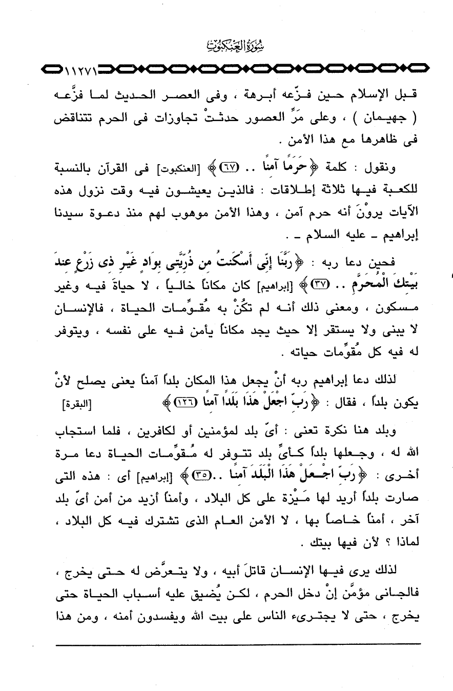 لذلك يرى فيها الإنسان قاتلَ أبيه، ولا يتعرَّض له حتى يخرج، فالجاني مؤمَّن إنْ دخل الحرم، لكن يُضيق عليه أسباب الحياة حتى يخرج، حتى لا يجترئ الناس على بيت الله ويفسدون أمنه، ومن هذا
