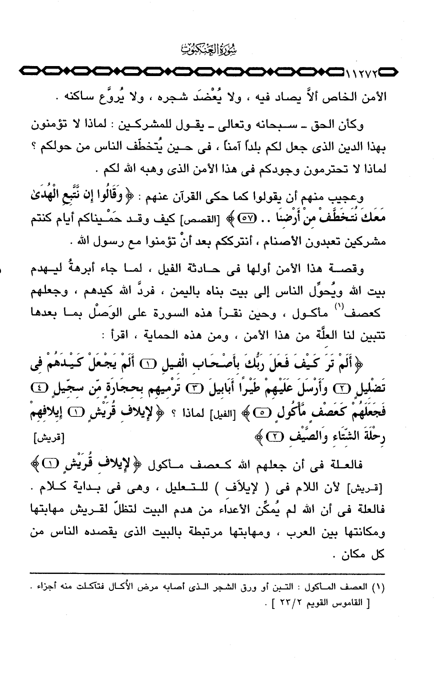 وقصة هذا الأمن أولها في حادثة الفيل، لما جاء أبرهةُ ليهدم بيت الله ويُحوِّل الناس إلى بيت بناه باليمن، فردَّ الله كيدهم، وجعلهم كعصف مأكول، وحين نقرأ هذه السورة على الوَصْل بما بعدها تتبين لنا العِلَّة من هذا الأمن، ومن هذه الحماية، اقرأ: {أَلَمْ تَرَ كَيْفَ فَعَلَ رَبُّكَ بِأَصْحَابِ الفيل أَلَمْ يَجْعَلْ كَيْدَهُمْ فِي تَضْلِيلٍ وَأَرْسَلَ عَلَيْهِمْ طَيْراً أَبَابِيلَ تَرْمِيهِم بِحِجَارَةٍ مِّن سِجِّيلٍ فَجَعَلَهُمْ كَعَصْفٍ مَّأْكُولٍ} [الفيل: 1 - 5] لماذا؟ {لإِيلاَفِ قُرَيْشٍ إِيلاَفِهِمْ رِحْلَةَ الشتآء والصيف} [قريش: 1 - 2] .