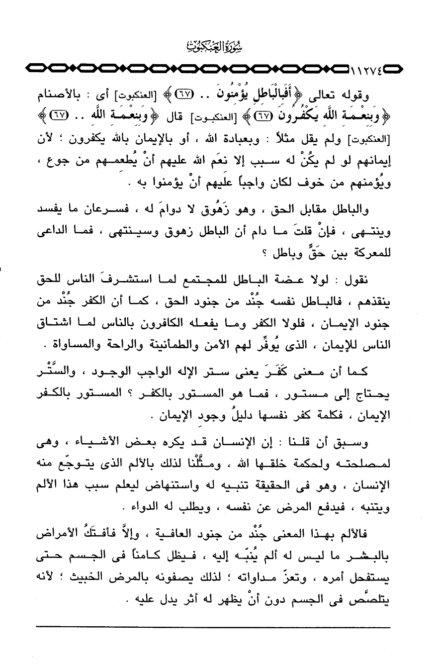 . .} [العنكبوت: 67] أي: بالأصنام {وَبِنِعْمَةِ الله يَكْفُرُونَ} [العنكبوت: 67] قال {وَبِنِعْمَةِ الله} [العنكبوت: 67] ولم يقل مثلاً: وبعبادة الله، أو بالإيمان بالله يكفرون؛ لأن إيمانهم لو لم يكُنْ له سبب إلا نِعمَ الله عليهم أنْ يُطعِمهم من جوع، ويُؤمنهم من خوف لكان واجباً عليهم أنْ يؤمنوا به.
