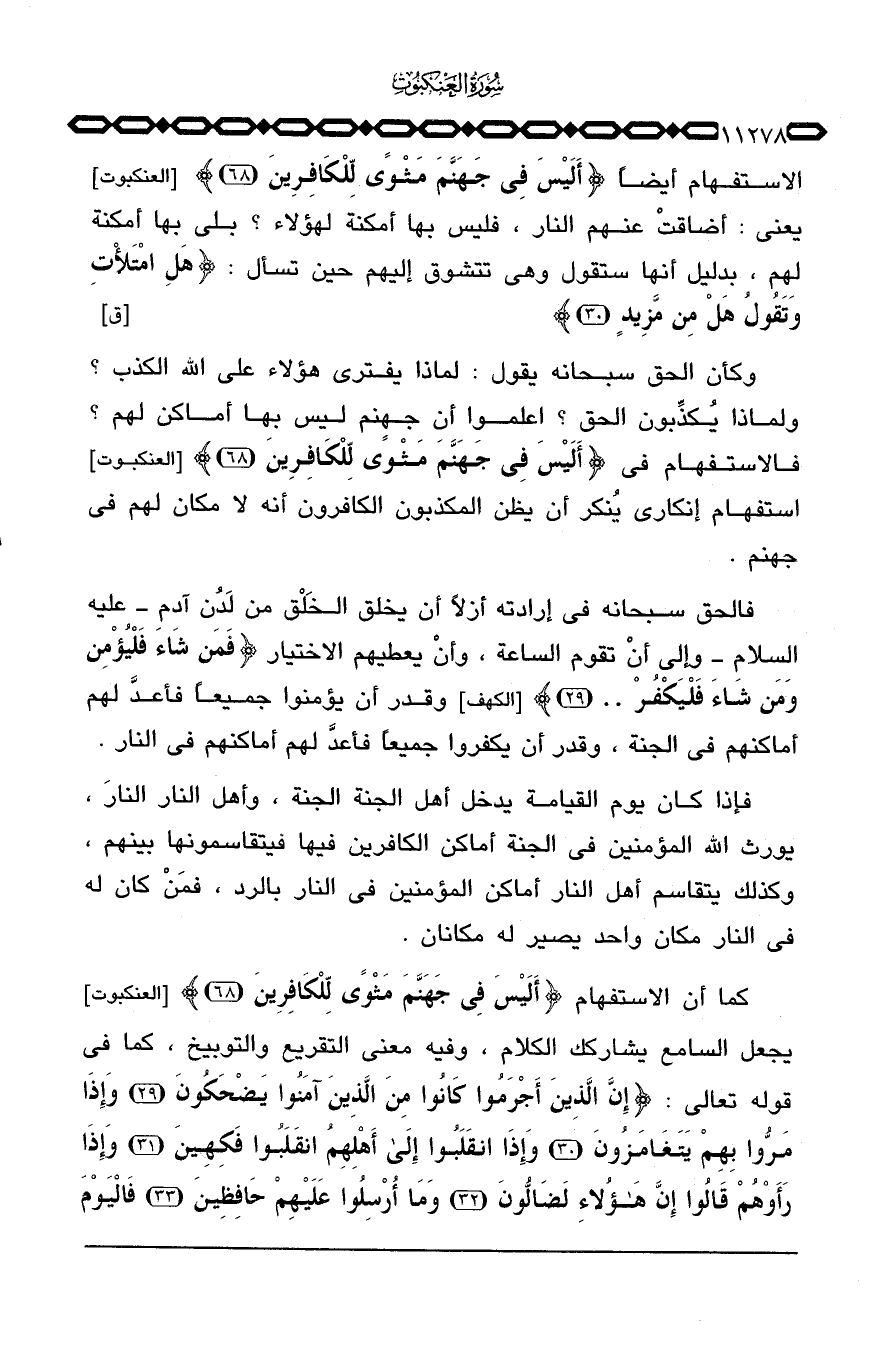 الاستفهام أيضاً {أَلَيْسَ فِي جَهَنَّمَ مَثْوًى لِّلْكَافِرِينَ} [العنكبوت: 68] يعني: أضاقتْ عنهم النار، فليس بها أمكنة لهؤلاء؟ بلى بها أمكنة لهم، بدليل أنها ستقول وهي تتشوق إليهم حين تسأل: {هَلِ امتلأت وَتَقُولُ هَلْ مِن مَّزِيدٍ} [ق: 30] .