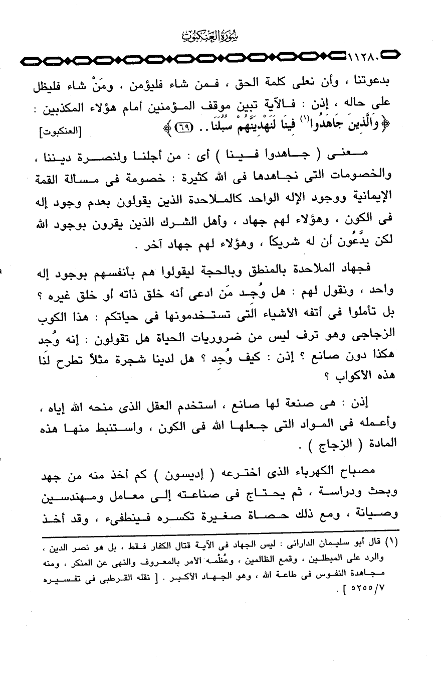 فجهاد الملاحدة بالمنطق وبالحجة ليقولوا هم بأنفسهم بوجود إله واحد، ونقول لهم: هل وٌجِد مَن ادعى أنه خلق ذاته أو خلق غيره؟ بل تأملوا في أتفه الأشياء التي تستخدمونها في حياتكم: هذا الكوب الزجاجي وهو ترف ليس من ضروريات الحياة هل تقولون: إنه وُجد هكذا دون صانع؟ إذن: كيف وُجِد؟ هل لدينا شجرة مثلاً تطرح لنا هذه الأكواب؟