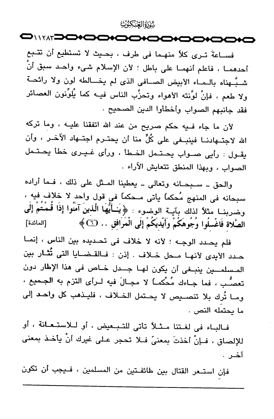 فلم يحدد الوجه؛ لأنه لا خلاف في تحديده بين الناس، إنما حدد الأيدي لأنها محل خلاف. إذن: فالقضايا التي تُثار بين المسلمين ينبغي أن يكون لها جدل خاص في هذا الإطار دون تعصُّب، فما جاءك مُحْكماً لا مجالَ فيه لرأي التزم به الجميع، وما تُرِك بلا تنصيص لا يحتمل الخلاف، فليذهب كل واحد إلى ما يحتمله النص.