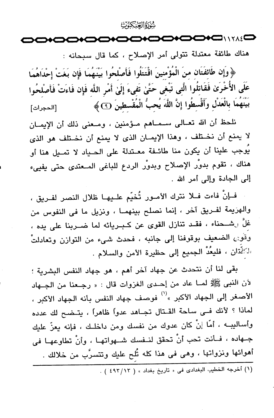 فإنْ فاءت فلا نترك الأمور تُخيّم عليها ظلال النصر لفريق، والهزيمة لفريق آخر، إنما نصلح بينهما، ونزيل ما في النفوس من غِلٍّ وشحناء، فقد تنازل القوي عن كبريائه لما ضربنا على يده، وَقوي الضعيف، بوقوفنا إلى جانبه، فحدث شيء من التوازن وتعادلتْ الكِفّتان، فليعُدْ الجميع إلى حظيرة الأمن والسلام.