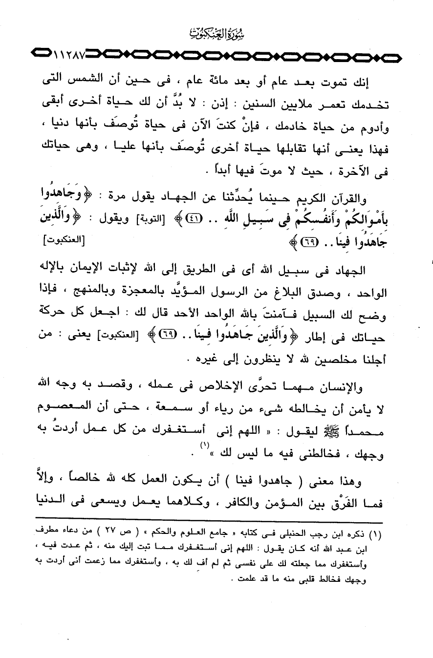 وهذا معنى (جاهدوا فينا) أن يكون العمل كله لله خالصاً، وإلاَّ فما الفَرْق بين المؤمن والكافر، وكلاهما يعمل ويسعى في الدنيا