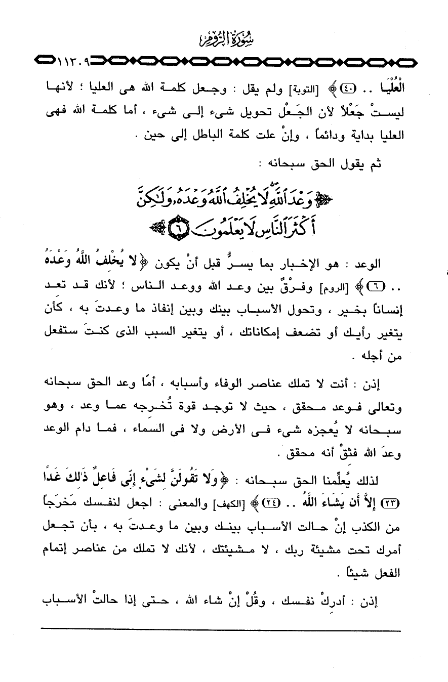 لذلك يُعلِّمنا الحق سبحانه: {وَلاَ تَقْولَنَّ لِشَيْءٍ إِنِّي فَاعِلٌ ذلك غَداً إِلاَّ أَن يَشَآءَ الله ... } [الكهف: 23 - 24] والمعنى: اجعل لنفسك مَخرجَاً من الكذب إنْ حالت الأسباب بينك وبين ما وعدتَ به، بأن تجعل أمرك تحت مشيئة ربك، لا مشيئتك، لأنك لا تملك من عناصر إتمام الفعل شيئاً.