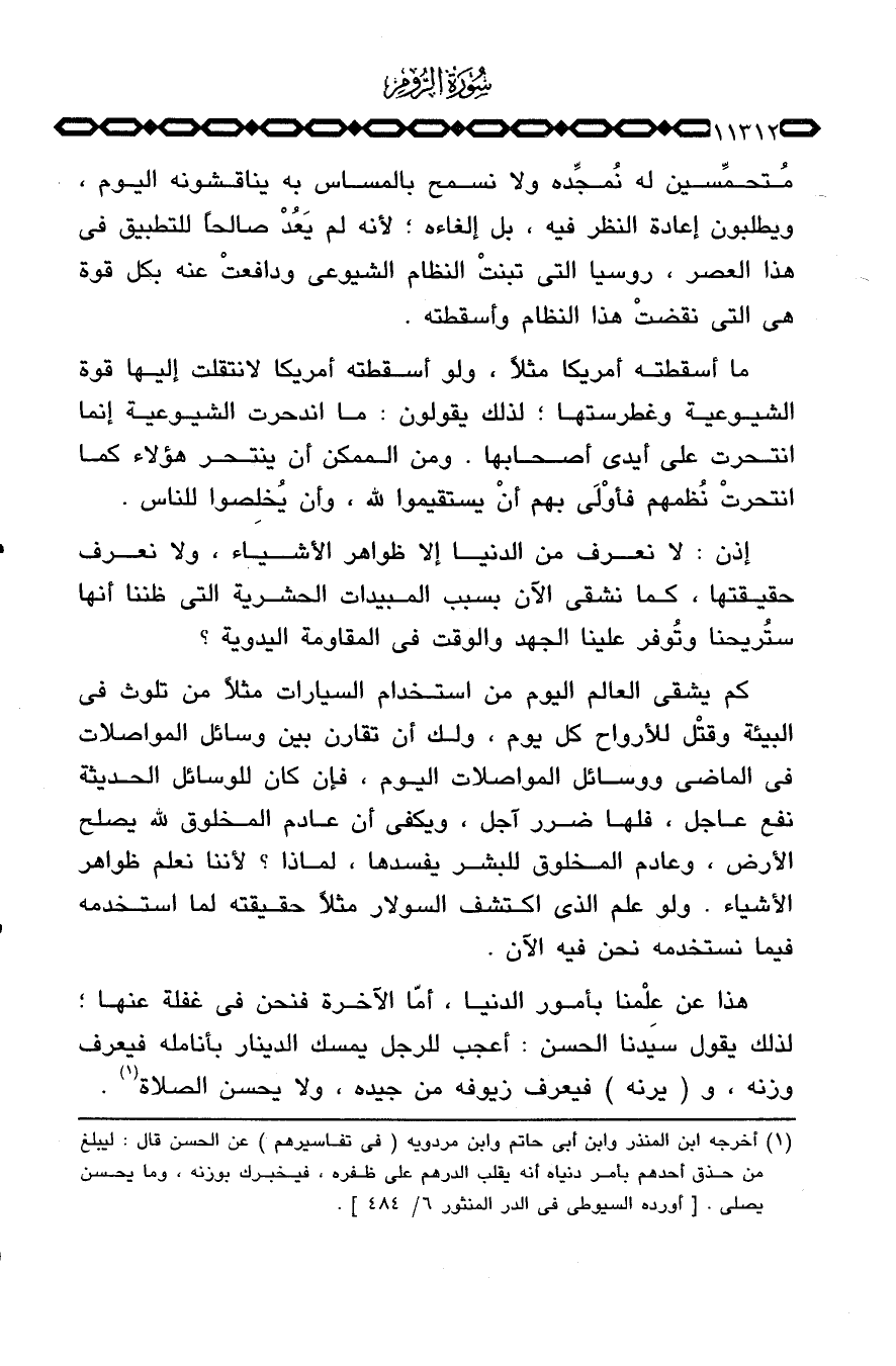 هذا عن عِلْمنا بأمور الدنيا، أمّا الآخرة فنحن في غفلة عنها؛ لذلك يقول سيدنا الحسن: أعجب للرجل يمسك الدينار بأنامله فيعرف وزنه، و (يرنه) فيعرف زيوفه من جيده، ولا يحسن الصلاة.
