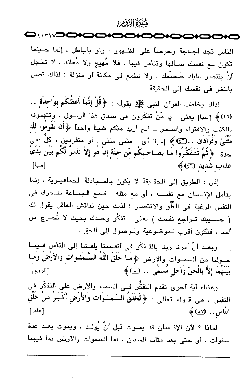 لذلك يخاطب القرآن النبي صَلَّى اللَّهُ عَلَيْهِ وَسَلَّم َ بقوله: {قُلْ إِنَّمَآ أَعِظُكُمْ بِوَاحِدَةٍ ... } [سبأ: 46] يعني: يا مَنْ تفكِّرون في صدق هذا الرسول، وتتهمونه بالكذب والافتراء والسحر. . الخ أريد منكم شيئاً واحداً {أَن تَقُومُواْ لِلَّهِ مثنى وفرادى ... } [سبأ: 46] أي: مثنى مثنى، أو منفردين، كلٌّ على حدة {ثُمَّ تَتَفَكَّرُواْ مَا بِصَاحِبِكُمْ مِّن جِنَّةٍ إِنْ هُوَ إِلاَّ نَذِيرٌ لَّكُمْ بَيْنَ يَدَيْ عَذَابٍ شَدِيدٍ} [سبأ: 46] .