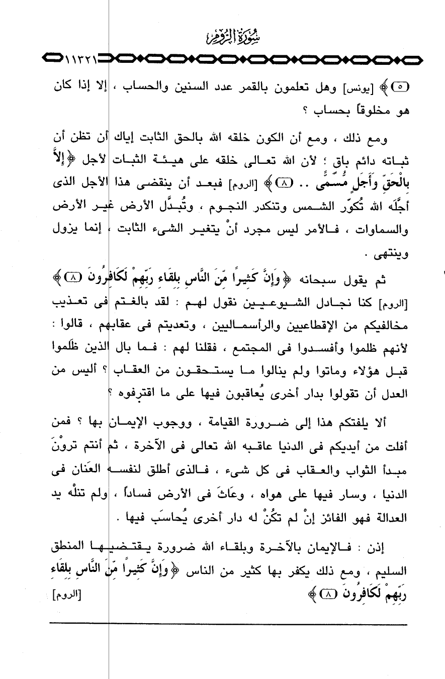ثم يقول سبحانه {وَإِنَّ كَثِيراً مِّنَ الناس بِلِقَآءِ رَبِّهِمْ لَكَافِرُونَ} [الروم: 8] كنا نجادل الشيوعيين نقول لهم: لقد بالغتم في تعذيب مخالفيكم من الإقطاعيين والرأسماليين، وتعديتم في عقابكم، قالوا: لأنهم ظلموا وأفسدوا في المجتمع، فقلنا لهم: فما بال الذين ظلموا قبل هؤلاء وماتوا ولم ينالوا ما يستحقون من العقاب؟ أليس من العدل أن تقولوا بدار أخرى يُعاقبون فيها على ما اقترفوه؟