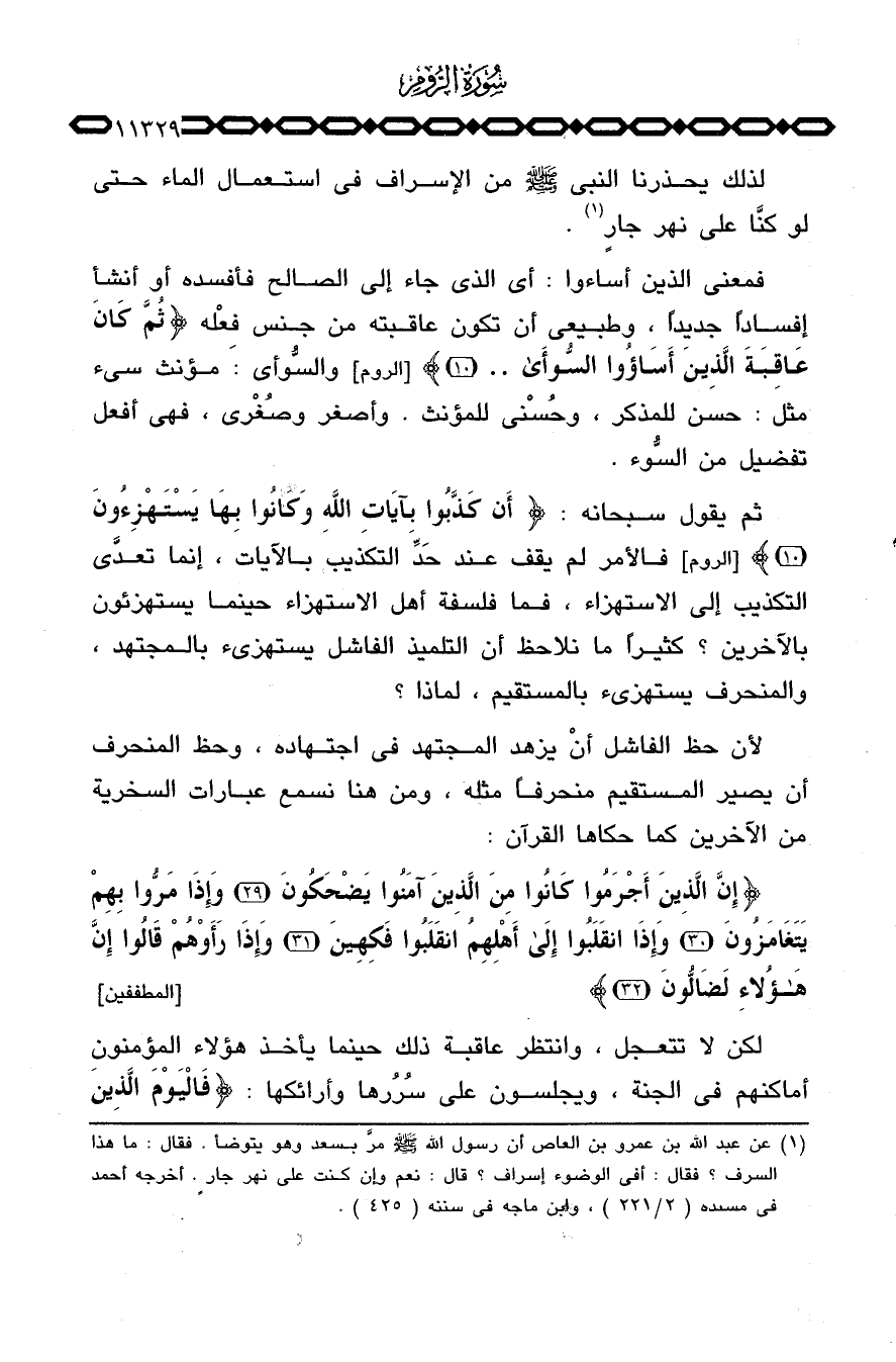 لذلك يحذرنا النبي صَلَّى اللَّهُ عَلَيْهِ وَسَلَّم َ من الإسراف في استعمال الماء حتى لو كنَّا على نهر جارٍ.