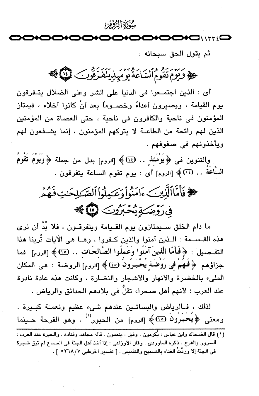 ما دام الخلق سيمتازون يوم القيامة ويتفرقون، فلا بُدَّ أن نرى هذه القسمة: الذين آمنوا والذين كفروا، وها هي الآيات تُرينا هذا التفصيل: {فَأَمَّا الذين آمَنُواْ وَعَمِلُواْ الصالحات ... } [الروم: 15] فما جزاؤهم {فَهُمْ فِي رَوْضَةٍ يُحْبَرُونَ} [الروم: 15] الروضة: هي المكان المليء بالخضرة والأنهار والأشجار والنضارة، وكانت هذه عادة نادرة عند العرب؛ لأنهم أهل صحراء تقلُّ في بلادهم الحدائق والرياض.