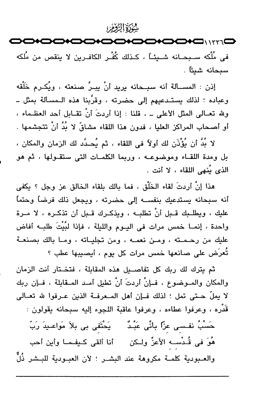 هذا إنْ أردتَ لقاء الخَلْق، فما بالك بلقاء الخالق عَزَّ وَجَلَّ؟ يكفي أنه سبحانه يستدعيك بنفسه إلى حضرته، ويجعل ذلك فرضاً وحتماً عليك، ويطلبك قبل أنْ تطلبه، ويذكرك قبل أن تذكره، لا مرة واحدة، إنما خمس مرات في اليوم والليلة، فإذا لبَّيْتَ طلبه أفاض عليك من رحمته، ومن نعمه، ومن تجلياته، وما بالك بصنعة تُعرَض على صانعها خمس مرات كل يوم، أيصيبها عطب؟