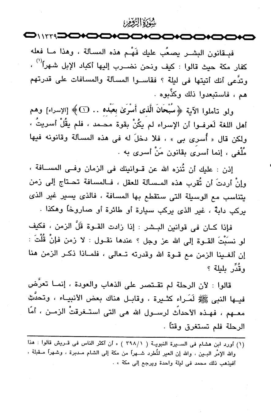 ولو تأملوا الآية {سُبْحَانَ الذي أسرى بِعَبْدِهِ ... } [الإسراء: 1] وهم أهل اللغة لَعرفوا أن الإسراء لم يكُنْ بقوة محمد، فلم يقُلْ أسريتُ، ولكن قال: «أُسرِي بي» ، فلا دخلَ له في هذه المسألة وقانونه فيها مُلْغى، إنما أسرى بقانون مَنْ أسرى به.