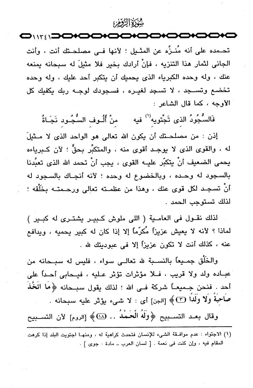 تحمده على أنه مُنزَّه عن التمثيل؛ لأنها في مصلحتك أنت، وأنت الجاني لثمار ها التنزيه، فإنْ أرادك بخير فلا مثيلَ له سبحانه يمنعه عنك، وله وحده الكبرياء الذي يحميك أن يتكبر أحد عليك، وله وحده تخضع وتسجد، لا تسجد لغيره، فسجودك لوجه ربك يكفيك كل الأوجه، كما قال الشاعر:
