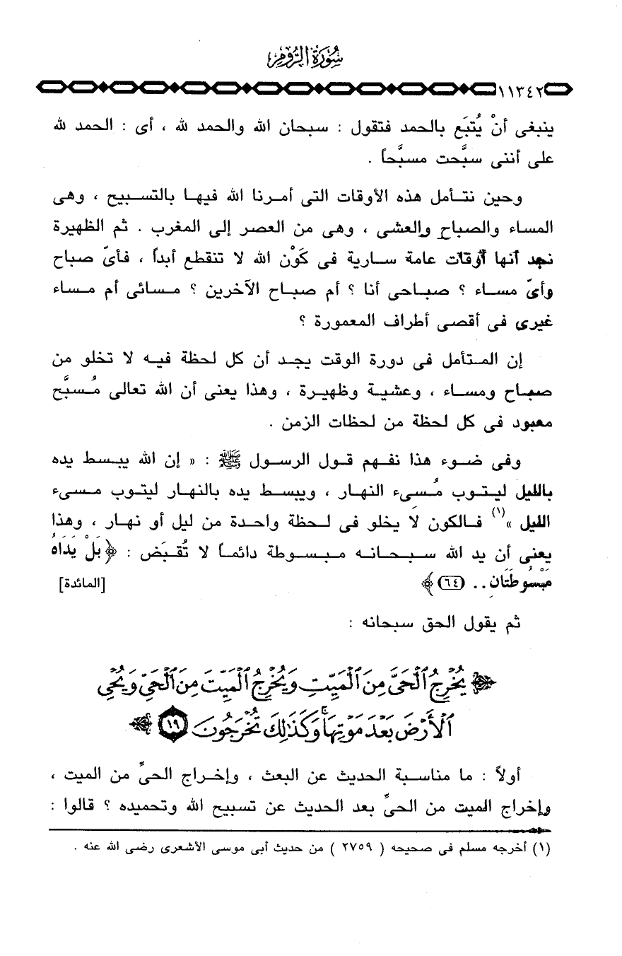 وحين نتأمل هذه الأوقات التي أمرنا الله فيها بالتسبيح، وهي المساء والصباح والعشي، وهي من العصر إلى المغرب، ثم الظهيرة نجد أنها أوقات عامة سارية في كَوْن الله لا تنقطع أبداً، فأيّ صباح وأيّ مساء؟ صباحي أنا؟ أم صباح الآخرين؟ مسائي أم مساء غيري في أقصى أطراف المعمورة؟
