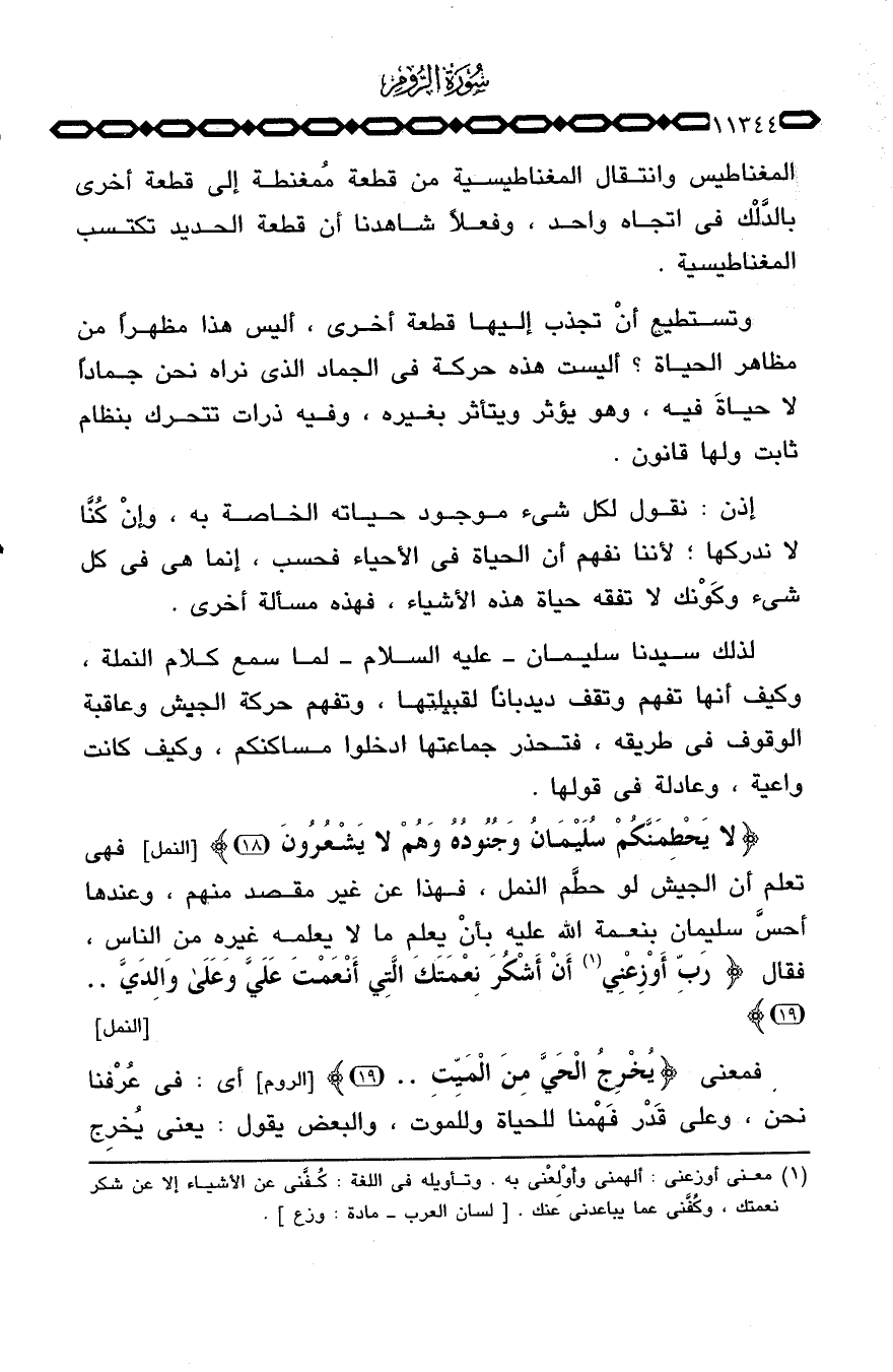 وتستطيع أنْ تجذب إليها قطعة أخرى، أليس هذا مظهراً من مظاهر الحياة؟ أليست هذه حركة في الجماد الذي نراه نحن جماداً لا حياةَ فيه، وهو يؤثر ويتأثر بغيره، وفيه ذرات تتحرك بنظام ثابت ولها قانون.