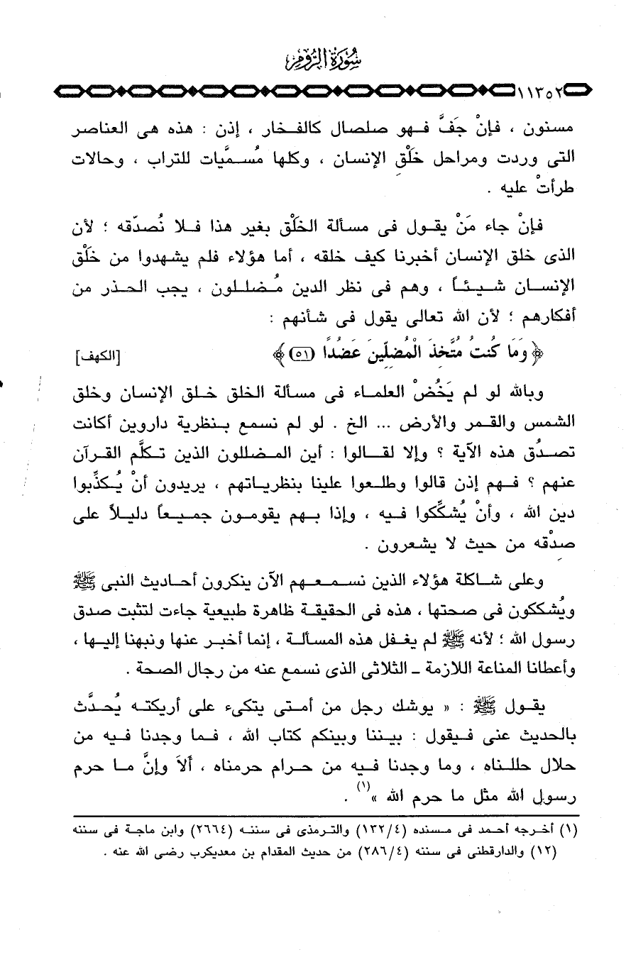 يقول صَلَّى اللَّهُ عَلَيْهِ وَسَلَّم َ: «يوشك رجل من أمتي يتكيء على أريكته يُحدَّث بالحديث عني فيقول: بيننا وبينكم كتاب الله، فما وجدنا فيه من حلال حللناه، وما وجدنا فيه من حرام حرمناه، أَلاَ وإنَّ ما حرم رسول الله مثل ما حرم الله» .