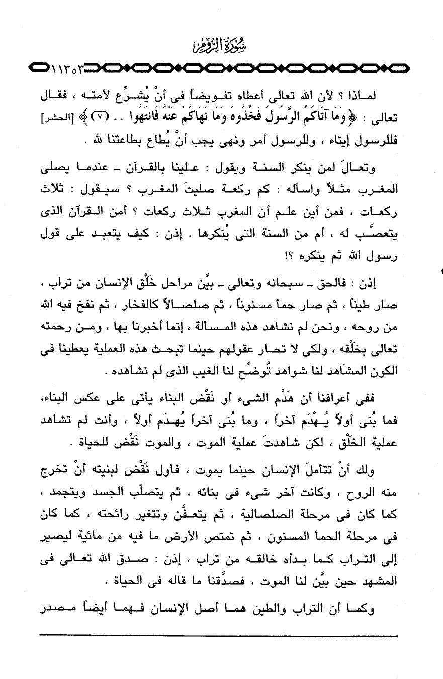 ولك أنْ تتأملَ الإنسان حينما يموت، فأول نَقْض لبنيته أنْ تخرج منه الروح، وكانت آخر شيء في بنائه، ثم يتصلّب الجسد ويتجمد، كما كان في مرحلة الصلصالية، ثم يتعفَّن وتتغير رائحته، كما كان في مرحلة الحمأ المسنون، ثم تمتص الأرض ما فيه من مائية ليصير إلى التراب كما بدأه خالقه من تراب، إذن: صدق الله تعالى في المشهد حين بيَّن لنا الموت، فصدَّقنا ما قاله في الحياة.